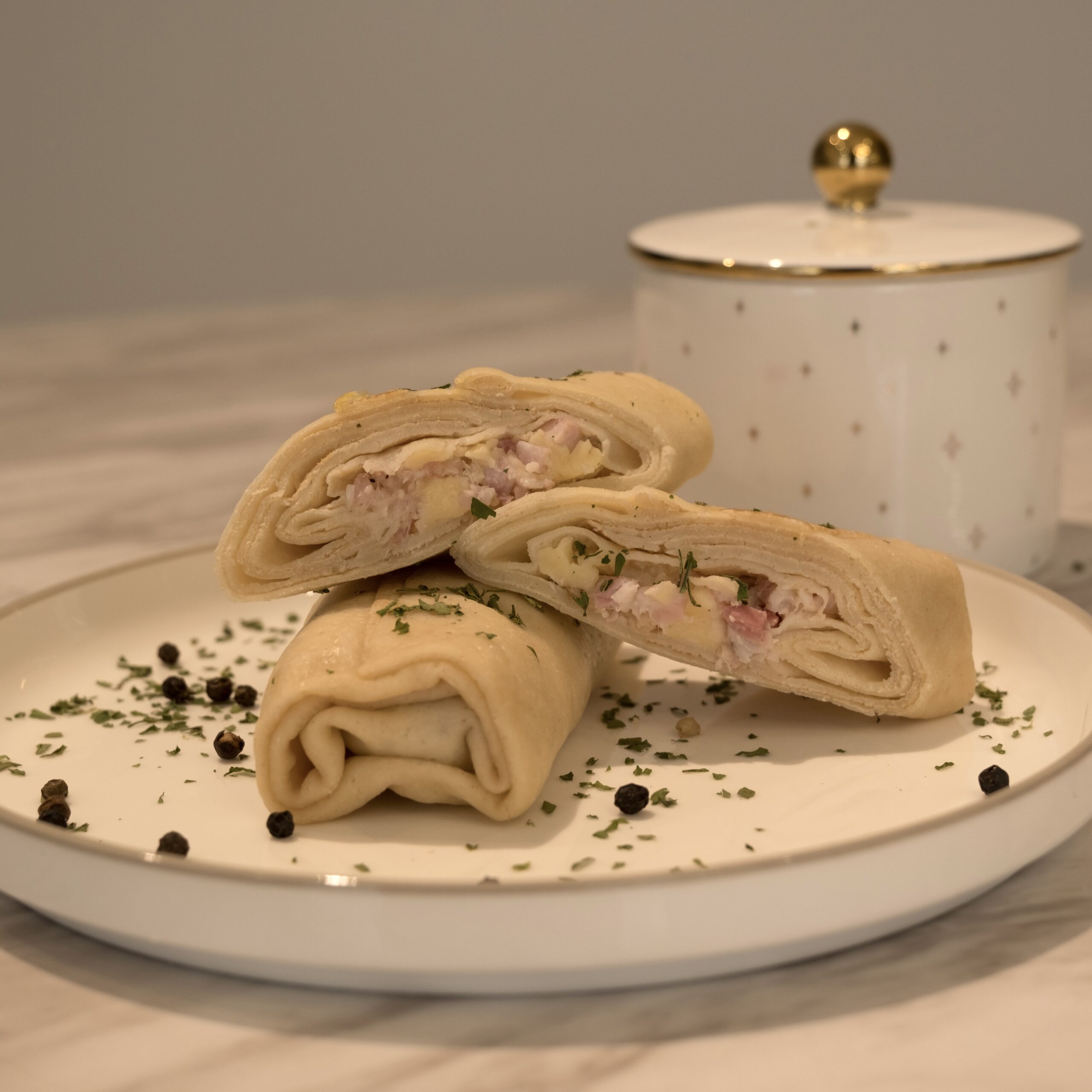 75%(kviešu milti, piens, ūdens, olu masa, rapšu eļļa, sāls, irdinātājs: dzeramā soda, citronskabe), pildījums25%: siers 50%, piradziņu gaļa 50%(cūku vaigu gaļa 80%, ūdens, šķiedrvielu maisījums (satur soju), ciete, dekstroze, modificēta ciete, garšvielas, dabīgais kūpināšanas aromatizētājs